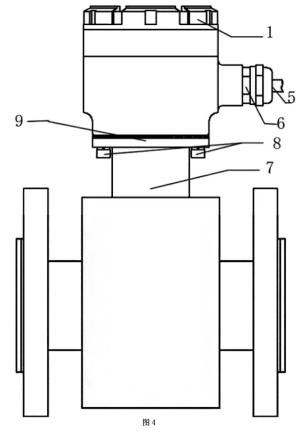 本實施例如圖4所示,分體接線盒用4只M6的螺釘8將殼體3與固定在流量傳感器7上端,売體3與傳感器7之間采用橡膠密封墊9密封。端子排7用兩個M4的螺釘固定在殼體內(nèi),接線端子通過連接電纜5,穿過安裝在売體上的格蘭頭6連接到變送器。分體蓋1通過螺紋擰緊在殼體3的上端,分體蓋1與殼體3的密封采用0型圏密封。使用時電纜與管道軸線方向一致,管道為垂直方向時,電纜出線方向朝下,從而不會造成外部的液體流入殼內(nèi)。