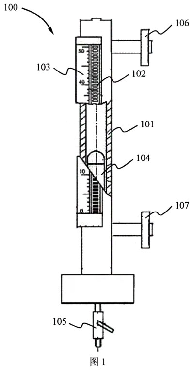 如圖1所示,本實用新型的保溫型塑料磁翻板液位計100主要包括:液位計主體101、翻板指示器102、標尺103、磁浮子104。其中,液位計主體101的內(nèi)部具有一中空管道,中空管道內(nèi)充填紅色液體(未圖示)。翻板指示器102設置于所述液位計主體101的上部的外表面上。標尺103位于所述翻板指示器102的下方,標尺103上標示有高度的刻度,以便于進行讀數(shù)操作。磁浮子104則設置于所述液位計主體101的中空管道內(nèi)。