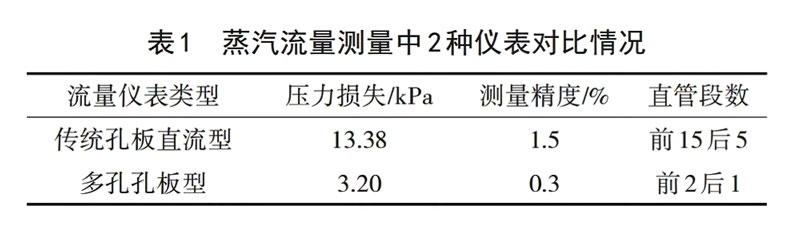 例如,在某聚丙烯生產項目中,需要對丙烯脫氣塔再沸器中的蒸汽進行流量測量。具體測量中,該企業ZUI初選擇的是傳統孔板節流形式的流量儀表,但是因為本次項目中對于工藝精度有著非常高的控制要求,需將精度控制在1%以內,同時應盡可能將測量過程中的壓力損失降低,且對于空間布局也具有一定的限制,在這樣的情況下,傳統孔板節流形式的流量儀表并不能滿足該項目的實際測量需求。基于此,企業便對原來的方案進行了優化改進,選擇用多孔孔板形式的流量儀表來替代傳統孔板節流形式的流量儀表。借助于相應的軟件來進行了流量儀表的設計計算,對傳統孔板節流形式的流量儀表和更換之后的多孔孔板形式流量儀表進行了對比,蒸汽流量測量中2種儀表對比情況見表1。