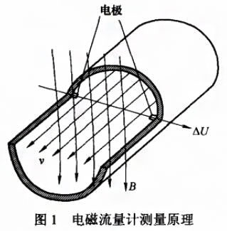 電磁流量計測量原理如圖1所示,管道內(nèi)流動的導(dǎo)電液體切割磁力線,將在兩端電極間產(chǎn)生電勢差ΔU,ΔU與磁通量密度B、液體流速ν符合弗來明右手定則。只要管道內(nèi)部流場理想、磁場穩(wěn)定,△U的大小與管道內(nèi)介質(zhì)平均流速成嚴(yán)格的線性關(guān)系,從而通過測量ΔU的大小可確定管道內(nèi)介質(zhì)流量。