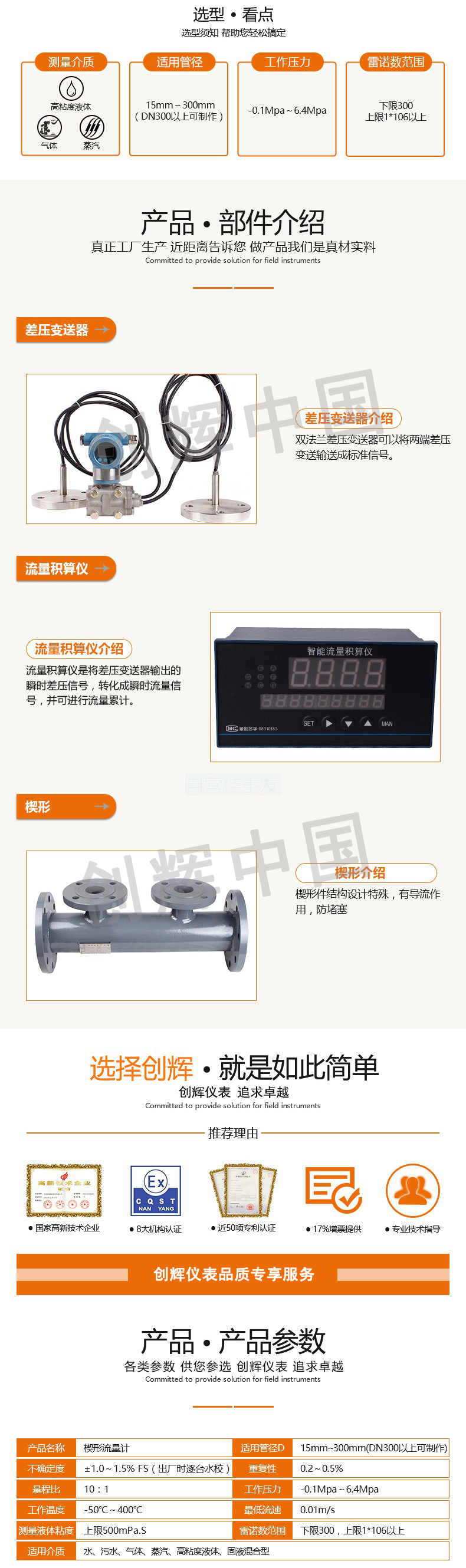 (2)可測量腐蝕性介質,由于差壓測量是采用隔膜式的雙法蘭差壓變送器,腐蝕性介質不能進入導壓管和差壓變送器,所以我公司采用耐腐蝕性材料加工楔形節流件,就能使儀表對腐性介質進行測量。