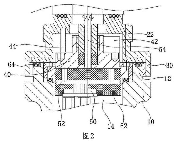 圖中各個(gè)標(biāo)號統(tǒng)一說明如下:10、殼體:12、聯(lián)接頭:14、流體通道:20、表頭22、表頭聯(lián)接座:30、聯(lián)接蓋:40、傳感器座:42、防轉(zhuǎn)動(dòng)片:44、防轉(zhuǎn)動(dòng)軸:50、差壓傳感器52、電路板:54、通孔:62、密封膠:64、密封圈。