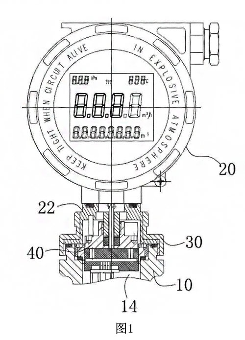 請參見圖1、圖3,本實(shí)施例的一種可防表頭過度旋轉(zhuǎn)的流量計(jì),包括表頭20和殼體10,表頭20與売體10通過聯(lián)接蓋30連接,殼體10內(nèi)設(shè)有流體通道14,在流體通道14內(nèi)設(shè)有差壓傳感器50,差壓傳感器50通過電線與表頭20連接,差壓傳感器50將數(shù)據(jù)信號通過電線傳輸至表頭20內(nèi),通過表頭內(nèi)安裝的數(shù)據(jù)處理單元和顯示單元分別將傳感器輸送過來的信號進(jìn)行處理和顯示。