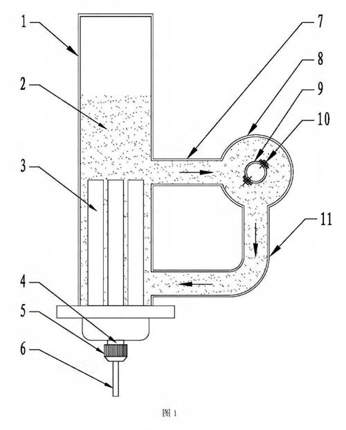 圖1為本發(fā)明電磁流量計(jì)的脫蠟裝置結(jié)構(gòu)示意圖;圖中序號說明:1箱體、2導(dǎo)熱介質(zhì)、3PTC陶瓷加熱器、4防爆接線座、5鎖緊帽、6電纜、7*介質(zhì)通道、8吸熱器、9測量導(dǎo)管、10電極、11第二介質(zhì)通道。